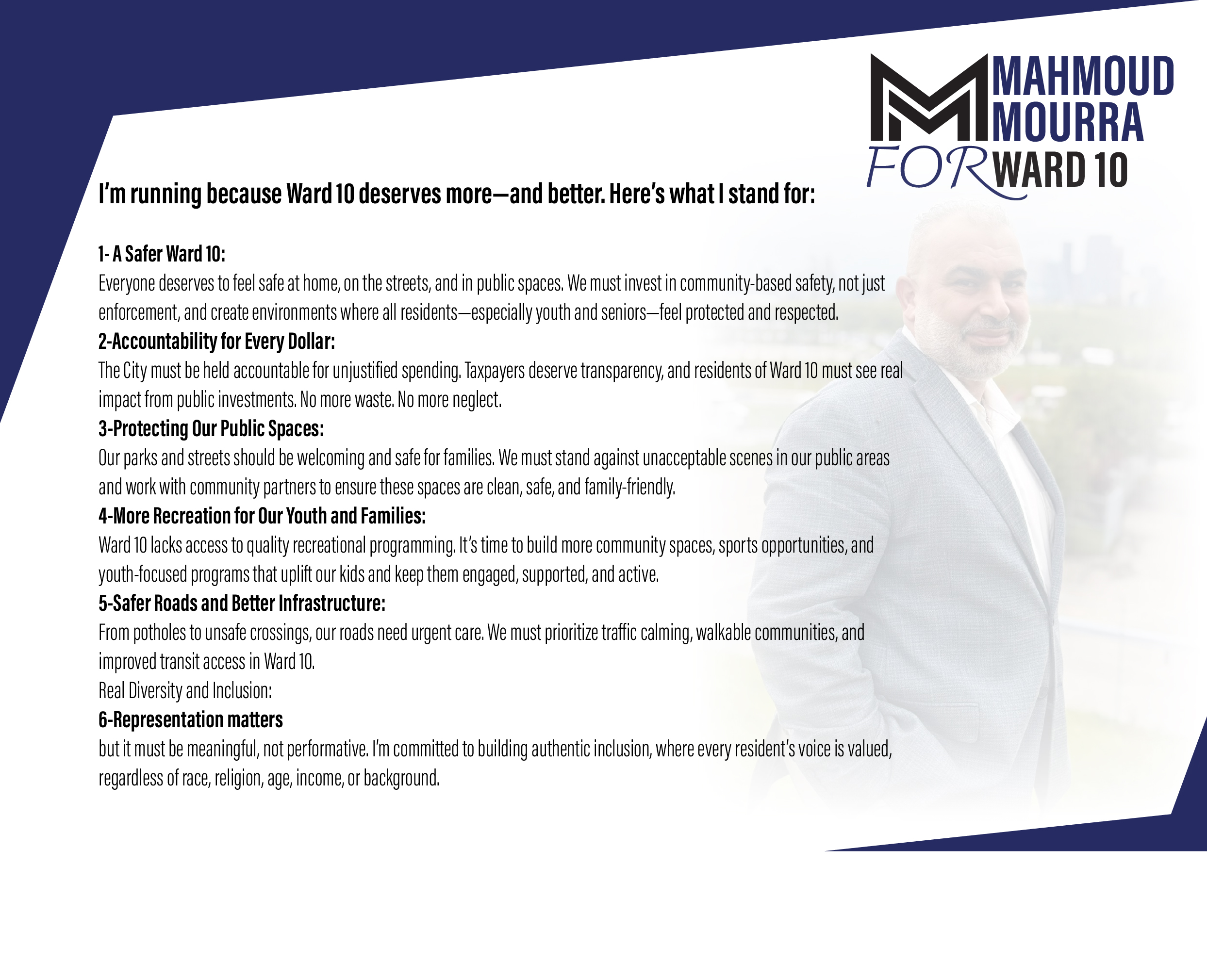 Hello, my name is Mahmoud Mourra, and I'm a proud father of five. I've proudly raised my children in Ward 10.
